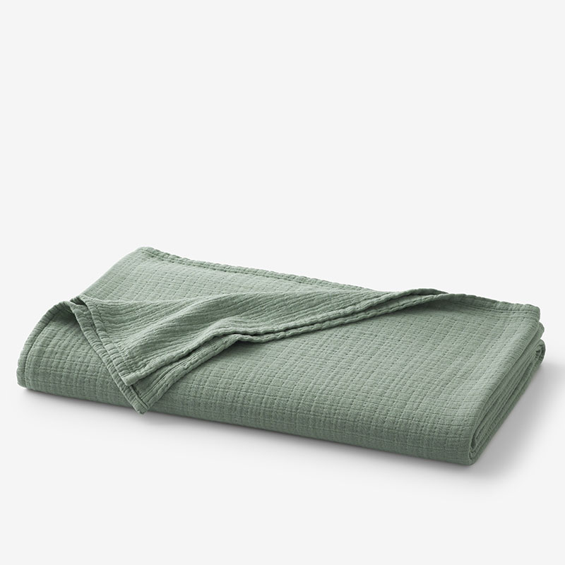 A new fresh look, yet still soft and oh-so-cozy, our lightweight and gauzy Gossamer Cotton Blanket is a dream come true in any season. Delicate hues and a breezy texture make this all-cotton blanket a must-have for summer, while its soft layers will keep you warm and toasty all winter. Lightweight, soft airy blanket 100% long staple combed cotton Woven of three gauzy layers of cotton Finished with cleaned hemmed edges Stone-washed and garment dyed Also available in an oversized throw OEKO-TEX® STANDARD 100 certification keeps you and your family safe from harmful substances (Certification number 18. HUS. 52388, Hohenstein HTTI) Made in Portugal | Gossamer Cotton Blanket - Thyme, Full - Green | The Company Store