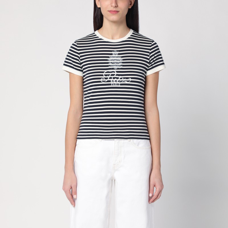 Crewneck T-shirt by FRAME x Ritz Paris in cream and navy blue striped cotton, featuring short sleeves and logo embroidery on the chest and back.