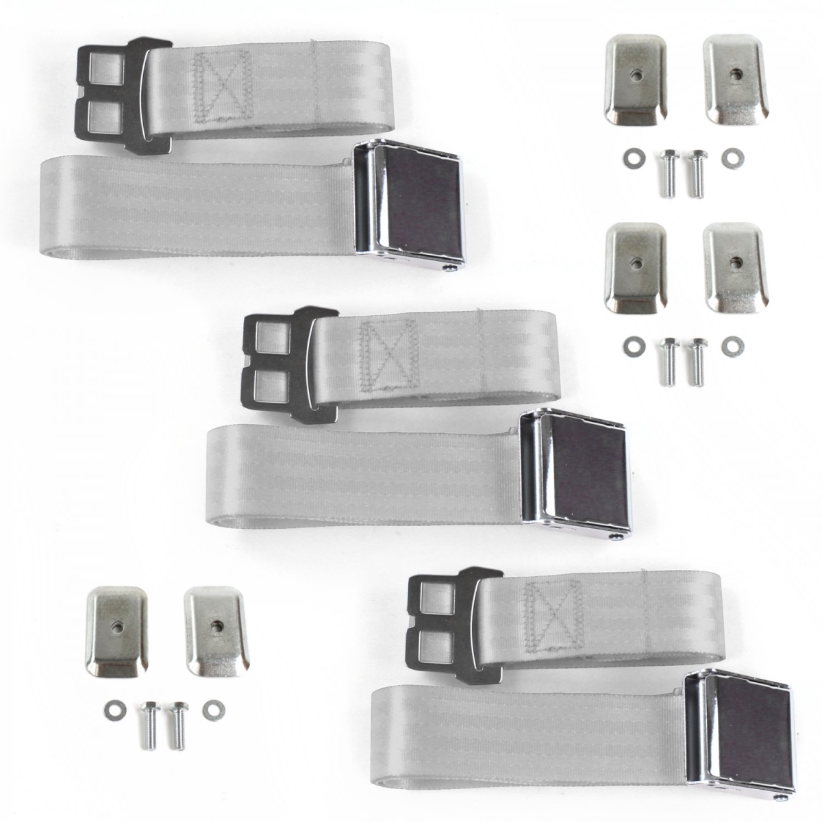 Upgrade your classic Ford with the ultimate in safety and style. Our 1941-1948 Ford Airplane 2-Point Lap Bench Seat Belt Kit combines vintage aesthetics with modern protection. Featuring three heavy-duty gray belts with authentic airplane-style buckles, this kit delivers both period-correct appearance and reliable security.