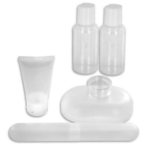 Take all your essentials on the go with this 6-piece Toiletry Travel Bottle Set featuring an assortment of durable plastic containers that fit in a convenient zippered carrying bag with a hanging loop. Set includes: 1- 1.69oz tube, 2 - 2.7oz bottles, 1 - lotion container, 1 - toothbrush holder and 1 - soap holder. Color: transparent, white Material: Plastic, Vinyl Meets airline requirements 96 sets per case Priced per set Comes packaged in a hanging poly bag 2380727