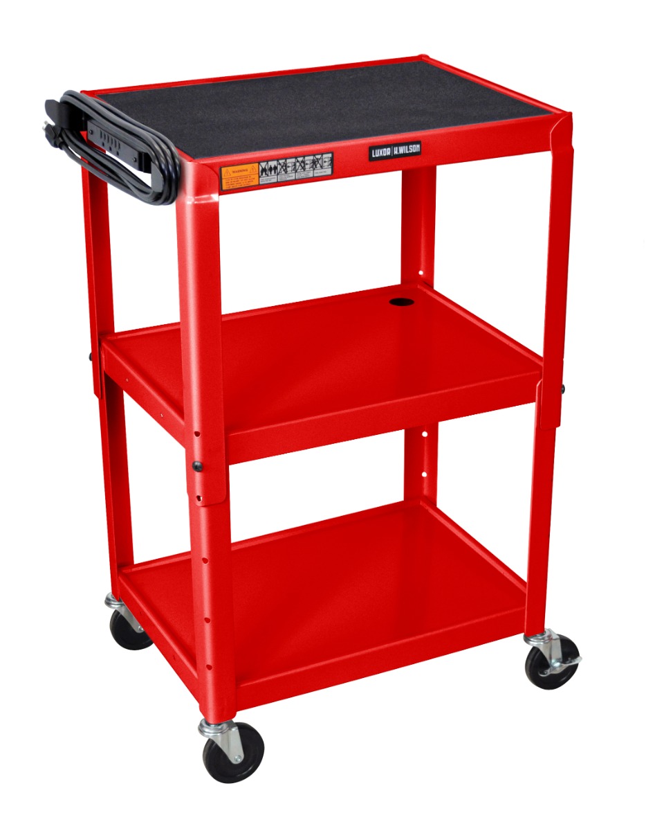 This popular multipurpose utility cart will securely store and transport your valuable electronic equipment from room to room. The steel construction and robotically welded shelves ensure long-lasting durability in tough environments. Textured mats and retaining lips keep shelf contents securely in place while the adjustable top shelf can be set from 24" to 42"-thick and includes a three-outlet electrical assembly for convenient power access. This mobile cart is also easy to maneuver and can be quickly stabilized thanks to four 4" full-swivel casters, two with locking brakes.