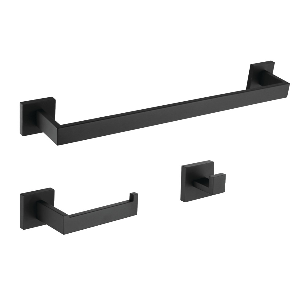 - 3-piece bath hardware set includes 18-inch towel bar, toilet paper holder and robe hook