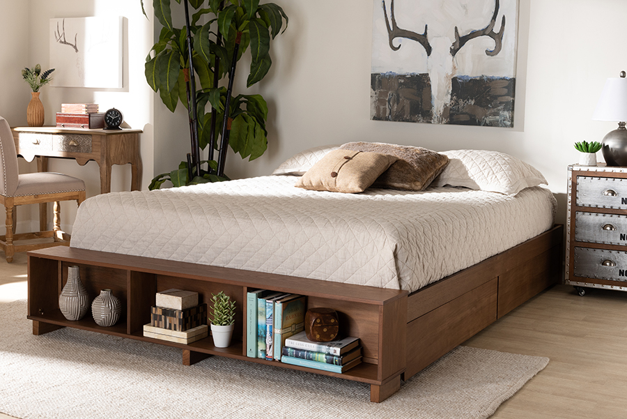 Find a convenient solution to your bedroom storage needs with the Arthur bed. A wood bench fitted with three shelves lines the front of the frame, perfect for showcasing books or decorations. The bed is made in Malaysia and includes four underside drawers to make this piece especially helpful in rooms with limited space. Assembly is required and a box spring is not necessary, as the bed with internal slats for mattress . The clean design of the Arthur is complemented by ash walnut brown finished wood, giving your space a modern, comfortable appeal.