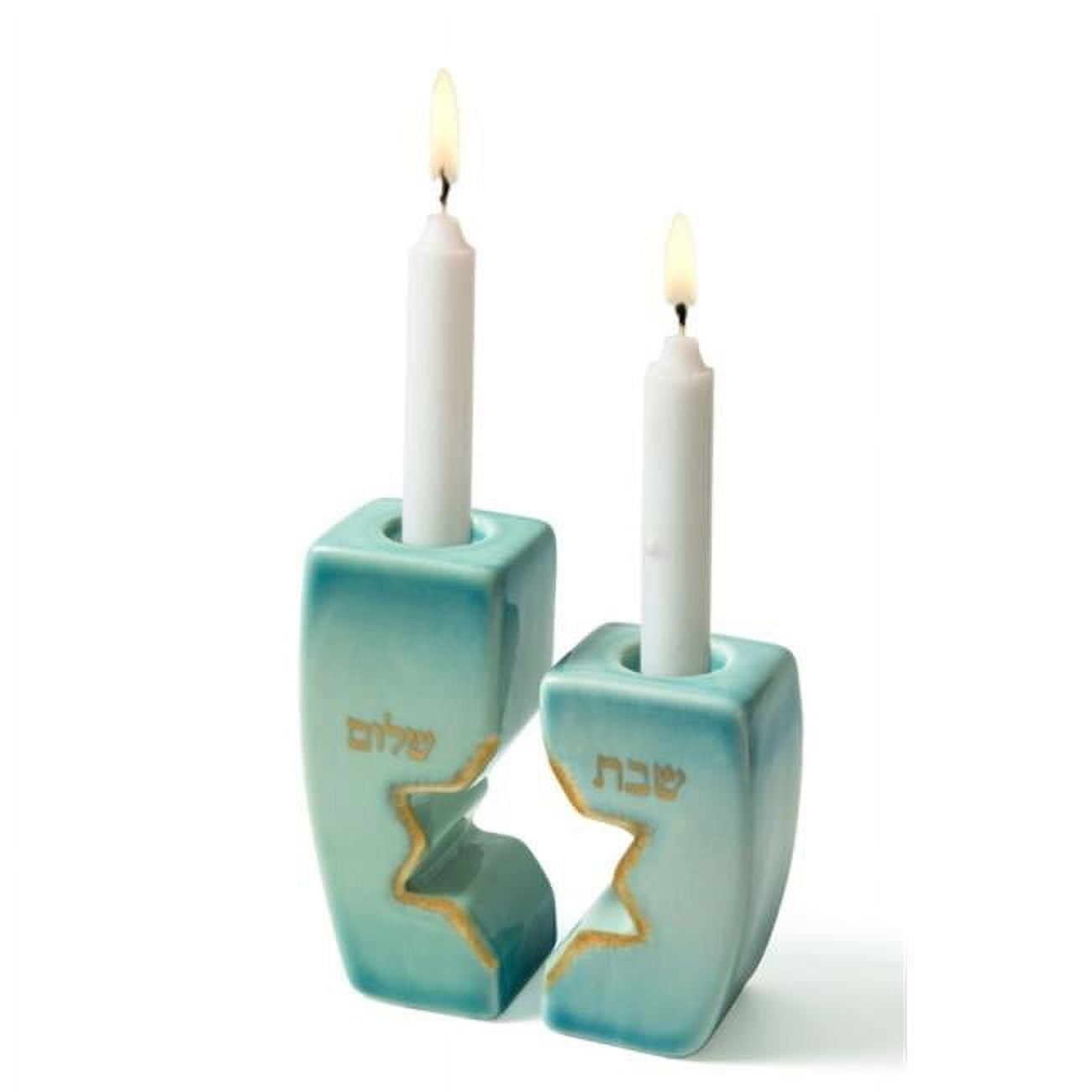 Our new Shabbat Ceramic candle holders would be a great gift for Shabbat! Set in a blue and gold tones these holders reads "Shabbat Shalom" in Hebrew and when you put the them together, they make up the star of David. A great addition to your decor or a perfect gift for the Israel lover.