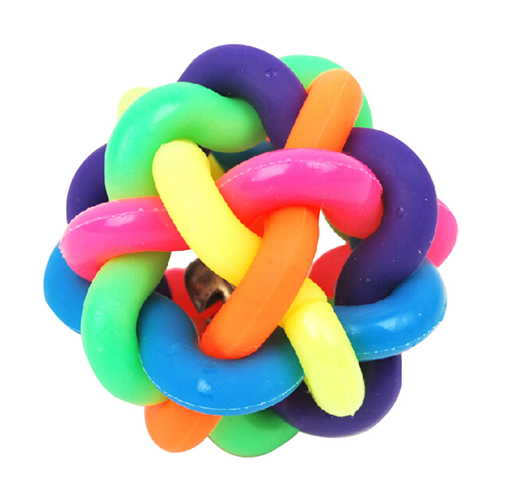 This ball on a rope can be thrown, kicked, carried and tugged. The rope can be pulled back and forth through the flexible ball but not out. It is durable yet soft and puncture resistant.