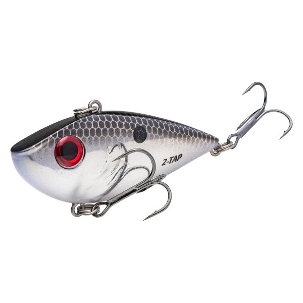 Red Eyed Shad Tungsten 2-Tap Lipless Rattlin 2.5" 1/2 oz. Chrome Black Hard Bait (REYESDTT12-402) by Strike King. The pros know. The original Strike King Red Eye Shad rattlebait is the most-thrown, most productive lipless crankbait on the pro tour. The Tungsten 2-Tap takes the Red Eye Shad's strongest feature to another level. Instead of using standard free floating rattles, the Strike King 2-Tap is built with a unique tungsten sound chamber that produces a distinctive double-tapping cadence on the retrieve. This noise is different enough to trigger strikes when standard rattles won't-which, on a tough tourney day, can spell the difference between cashing a check and going home empty-handed. Like the original Red Eye Shad, Strike King's Tungsten 2-Tap features the perfect shad-imitating body profile, with pro-designed paint jobs, large 3D red eyes, and premium VMC Vanadium Cone Cut Hooks.