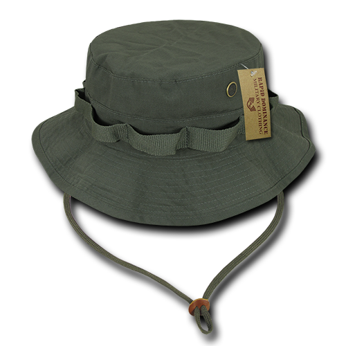 Our Classic Military Style Ripstop Jungle boonies features a tape band of branch loops sewn around the crown with a flat top, floppy brim, lightweight and crushable style, chin strap with leather fastener keep the hat secure on your head and 4 authentic metal mesh vents on the sides. Made to military specs from a 100% cotton ripstop fabric with a special reinforcing technique, making this hat resistant to tearing and ripping.