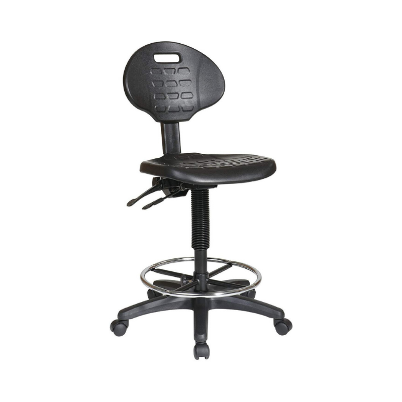 This urethane Ergonomic Drafting Chair is ideal for a wide range of applications including office, laboratory, workshop, garage, and clean room. The 360 swivel chair also features adjustable seat height, back height, and seat angle and also a movable chrome footrest. Contoured polyurethane seat, back, and heavy-duty nylon base contribute to its long-lasting performance.
