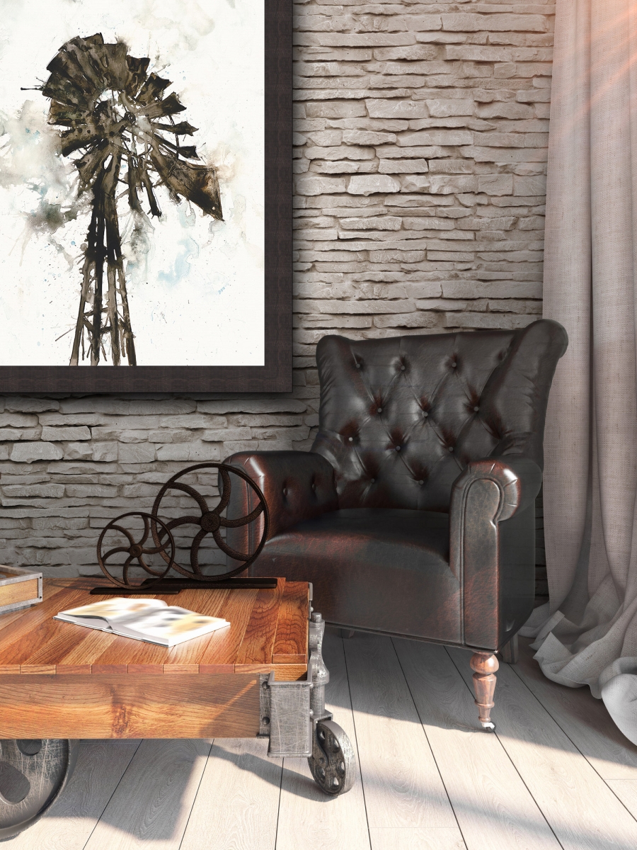 High quality embellished paper print framed in a 3 inch brown distressed rustic look frame. Modern watercolor rustic windmill image. A brushstroke effect gloss has been applied to the image to give a textured look to the print. A beautiful piece of framed artwork that will look great in the modern home. Hanging hardware included.