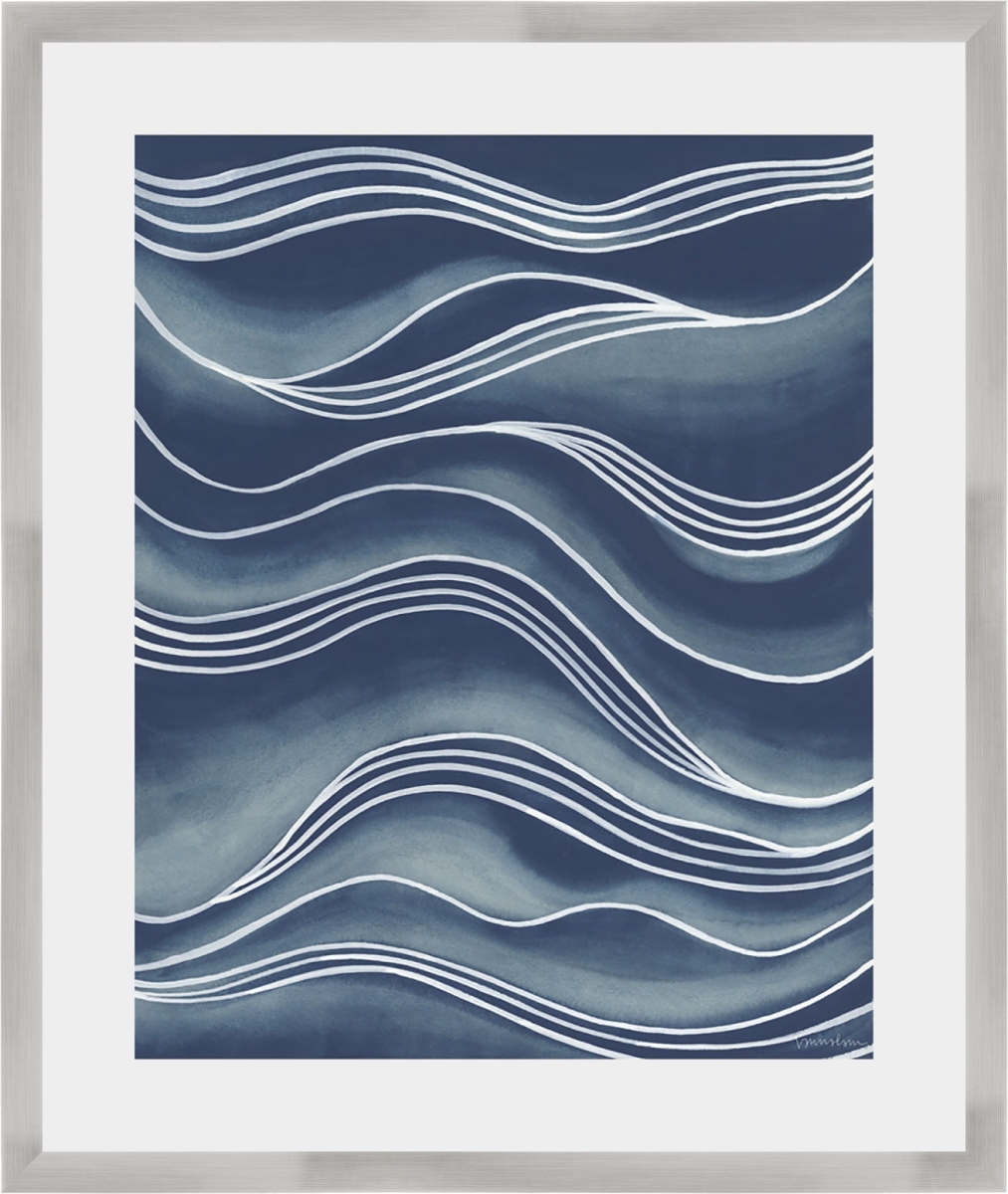 High quality paper print, framed in a 0.75 inch metallic brushed silver frame. Modern abstract coastal image. A beautiful piece of framed artwork that will look great in the modern home. Hanging hardware included.