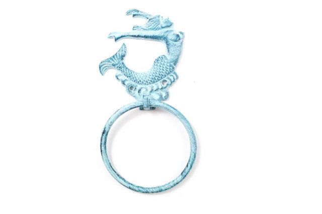 Whitewashed Cast Iron Arching Mermaid Towel Holder, Rustic Dark Blue - 9 in. .It adds that nautical touch to enhance your nautical bathroom decor. Made to hold three extra toilet paper rolls, this durable toilet paper stand 16" is crafted from cast iron.