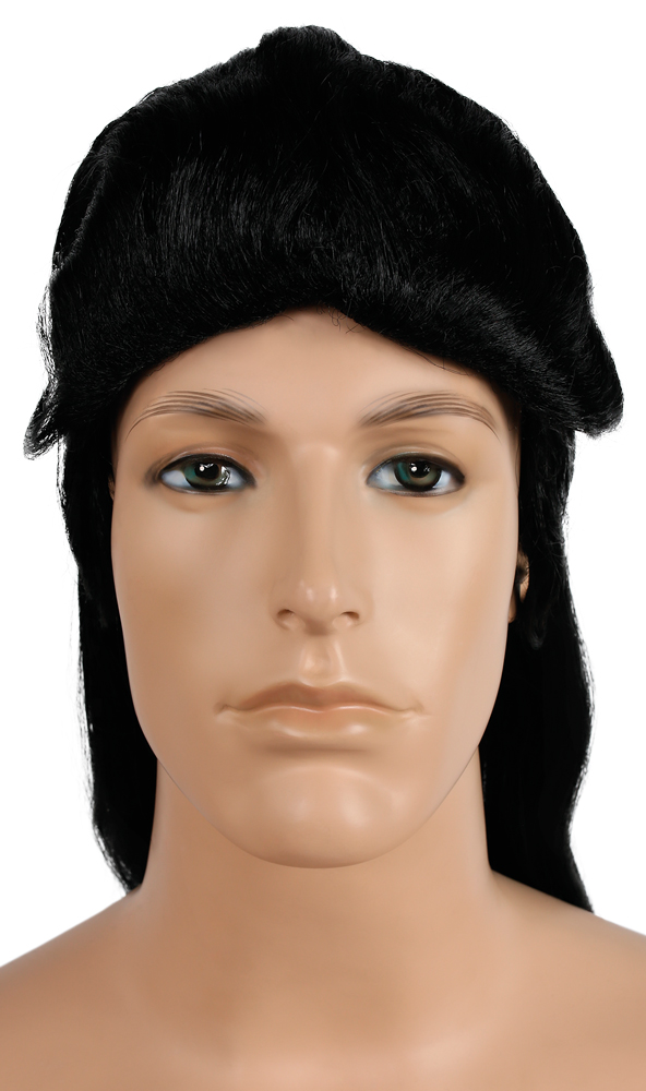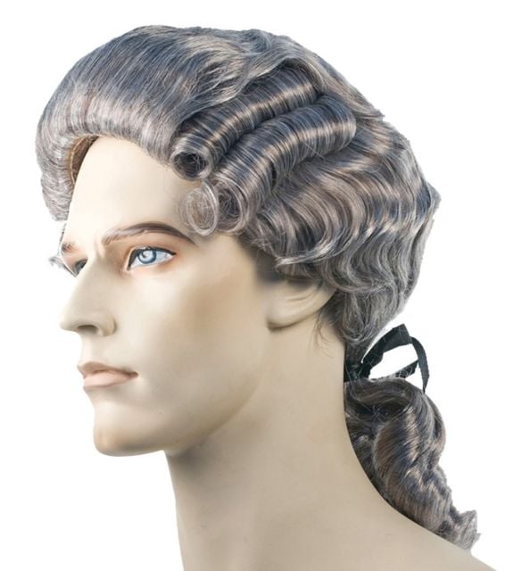Deluxe Colonial Man has two curls on each side with a wavy crown and ponytail with banana curls tied with a black bow. Made in a very fine white fiber.