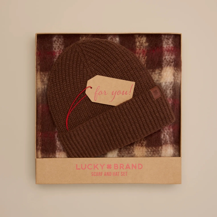 With a gift this good, there’s no reason to wait. For a friend or yourself, this scarf and hat box set is ready to keep you cozy now and through all the chilly days ahead. - 100% Acrylic - Lucky Brand Scarf And Hat Box Set - Women's Accessories Hat in Dark Brown
