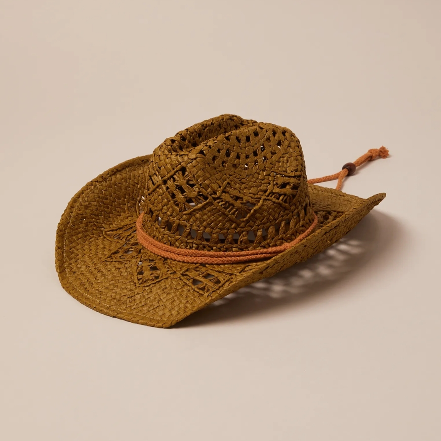Nail your next western-inspired look with this raffia cowboy hat featuring a high crown, curved brim and adjustable beaded strap for the perfect fit.23” circumference.14" brim with adjustable ties. - 0 - Lucky Brand Raffia Cowboy Strap Hat in Open Green