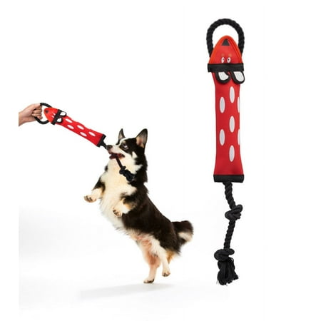 Made of professional grade fire hose material. The tightly-woven fibers can last longer and repeated use so there won t be small fibers stuck between the teeth. Included with ropes for owners so they can create new ways to play. Owners can hold at one end while the pets chew at the other end. You can also train your pets with the tug toys. The dog toys are stuffing free and include invincible squeakers. The squeakers will keep squeaking if punctured add fun for your dogs while chewing. At home or outdoors on land or in water! No worry about throwing toys in water any more for the toys can floats in the water. You can easily pick them up or your dog will go fetch it!