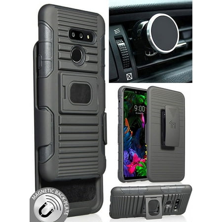COMPATIBILITY: LG G8 ThinQ (LM-G820) The Magnetic Grip Case is a tough and rugged case that is loaded with all kinds of extra utility. This case provides excellent protection enhanced grip kickstand viewing custom holster clip and features rear plate for quick and easy placement on the magnetic car mount (yup that s included too) RING STAND: Back of the case features unique kickstand that can also be used as a finger-grip. Thread your finger though the hole and now you ll be able to handle the phone better with one hand. No more drops! The kickstand allows you to prop your phone in horizontal position on a table or desk...ideal for watching movies and videos. MAGNETIC: This case is equipped with a built-in metal plate that makes this case compatible with magnetic car mounts (AC Vent Car Mount Included). This AC Vent mount uses magnetic connection that makes displaying your phone quick and easy! Now you ll be able to safely mount your phone in the blink of an eye. AC VENT MOUNT: Use this in your car truck RV SUV etc. Securely mounts onto traditional car air vent. The spring-loaded clamp can latch onto vertical or horizontal vent. The padded clamp will protect your air vent from scratches. MATERIAL: This phone case is made of flexible TPU and rubberized polycarbonate. The TPU material fits like a glove and it has a professional matte finish that will resist fingerprints. The hard shell will snap on the back of the TPU skin and it extends to all four corners of the phone - this offers excellent protection from drops. BELT CLIP HOLSTER: The industrial holster was custom made to fit this case face-inward. This design keeps your screen concealed and protected. Industrial belt clip will turn/lock in 13 different positions. Attach to your side and always have quick access to your phone.