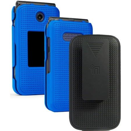 COMPATIBILITY: AT&T Cingular Flip 4 (U102AA) Cricket Debut Flip (U102AC) Sometimes we want a clip for our phone. Most times we just want slim protection. This Holcom is an ideal solution because you get the best of both worlds. This is a case + holster combination. You get the cover for your phone AND a holster belt clip that fits the phone/case. PHONE COVER: The case is composed of two hard shell covers that snap on the front and back of the phone. Your phone remains fully functional in the case with cutouts to access all buttons charger camera speaker headset. You can still flip the phone open and closed. The case is made of hard polycarbonate that has been treated with a powder coating for extra durability. Case also has ribbed grid pattern for enhanced tactile grip. BELT CLIP: Holster is made to fit the phone with case. The interior is lined with micro-fiber material. The holster is designed to fit the phone face-inward so your screen is concealed and protected (also fits phone face-out). Your phone is ultra-secure within the holster. The belt clip can turn/lock in 13 different positions and has a slim profile so it will not extend far from your waist and bump into things. Attach to your side and always have quick access to your phone. HOLSTER KICKSTAND: There is a hinge on the inside of the belt clip so you can prop open. This is handy for propping the clip on your table/desk. COLOR: This offer is for the BLUE color with grid texture pattern. The matte finish will resist fingerprints so your case will look great all day long!