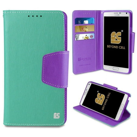 COMPATIBILITY: Samsung Galaxy Note 4 This Beyond Cell Infolio Wallet case is made for the Galaxy Note 4. Simplify your life with this unique wallet case! MATERIAL: The case is made of textured synthetic leather material that feels nice in your hand. Installation is easy: Open the case like a book and you ll see a form-fit TPU skin/shell on the inside of the case. Simply insert your phone in that shell close the wallet and you re done. STORAGE: This case features four (4) storage compartments on the interior left side: three credit card slots and one full length slot. How much will it hold? Each of the credit cards slots will accommodate multiple cards. The full length slot is a good location for folded cash or receipts. Now you can carry your phone credit cards business cards and dollar bills all in one case! FEATURES: This case will also function as a viewing stand. You can prop the phone in the horizontal position - this is great for watching videos and movies hands-free. The case will open and close like a book - features side flap that will keep the case closed. The flap has hidden magnetic closure so you don t have to worry about complicated snaps or buttons. You can still access camera buttons ports sensors and stylus. Flip open the case to access touchscreen. COLOR: (MINT/PURPLE) The exterior is mint. The side flap interior lining and phone shell are purple.