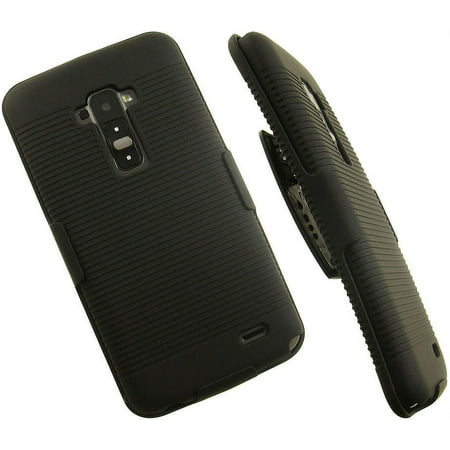 COMPATIBILITY: LG G Flex If you have a case on your phone then it will not fit in a traditional holster....until now! You get one black cover for your phone AND one holster belt clip that is custom made to fit the phone while inside the case. PHONE COVER: The cover is a black hard shell that snaps on the back of the phone. Your phone is fully functional in the case with cutouts to access all buttons and ports. The case is made of hard plastic that has been treated with a rubberized spray powder coating for extra grip and durability. Case also has ribbed lines for additional grip. PHONE HOLSTER: Holster is made to fit the phone with cover. Its also made of a hard plastic that has a rubberized texture coating. The interior is lined with micro-fiber material to ensure your lcd screen will remain scratch free. The holster will fit the phone face-inward to protect the lcd screen. Also fits the phone in both directions (insert the phone upsidedown for better access to headset port). You can access the 3.5mm headset while the phone is in the holster. Your phone is ultra secure within the holster. The belt clip on this holster will turn/lock in 13 different positions. The clip has a slim profile so it will not extend far from your waist and bump into things. Attach to your side and always have quick access to your phone. KICKSTAND: There is a hinge on the inside of the belt clip so you can prop open. This is great for standing the phone in horizontal position on your table or desk. COMPATIBILITY: This case/holster combo was designed for LG G Flex phone. Model numbers include: Unlocked F340 Unlocked D955 Unlocked D958 Unlocked D959 Unlocked F340s AT&T D950 Sprint LS995 T-Mobile D959n.