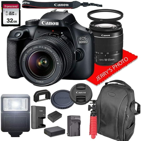 Canon EOS 4000D Camera Body Canon EF-S 18-55mm f/3.5-5.6 DC III Zoom Lens 32GB SD Memory Card Replacement Battery Replacement Battery Charger USB SD Card Reader Deluxe Backpack Gadget Bag Lens Cleaning Cloth Spider Tripod