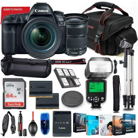 Continuing on in their legacy of powerful workhorse cameras Canon has released the EOS 5D Mark IV DSLR which is an outstanding still photography option and a capable 4K-capable video machine. This multimedia maven offers a newly developed 30.4MP full-frame CMOS sensor paired with the DIGIC 6+ image processor to balance fine detail and resolution with low-light performance and sensitivity. It can work within a native range of ISO 100-32000 expandable to an impressive ISO 50-102400 for sharp low-noise images in various conditions. Along with these improvements to image quality users will enjoy a performance boost with an enhanced AF system built-in Wi-Fi NFC and GPS among other features. This Custom Canon DSLR Bundle Includes: Canon Items & Accessories: Canon EOS 5D Mark IV DSLR Camera Canon EF 24-105mm f/3.5-5.6 IS STM Lens Canon LP-E6 Battery Canon LC-E6 Charger Canon Neck Strap Eye Cup Body Cap Lens Caps Sandisk 64GB High-Speed SDXC Memory Card Movavi Photo-Video-Manager-Focus-Denoise 5-Software Package (Digital Download) Shoulder Carrying Case with Extra Padding Camera Standard Tripod with Case TTL Flash - Automatic - Multi Mode - High Speed High-Quality Battery Grip (Replaces BG-E20) Extra Replacement Battery (Replaces LP-E6) Memory Card Reader USB 2.0 Camera Hand Grip Strap Lens Pen & Blower Microfiber Cloth