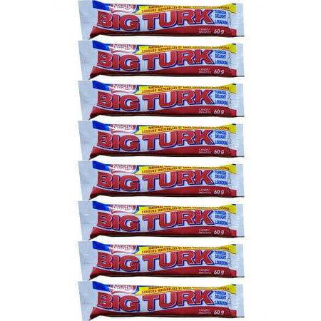THIS IS FOR 8 SINGLE BARS OF BIG TURK FROM CANADA - SHIPPED FROM U.S. Big Turk are Turkish Delight Candy Bar that are manufactured by Canada. Big Turk is one of the more unique candy bars on the market. It stands out by having just a very thin chocolate coating over pink Turkish Delight Chocolate. 8 BIG TURK BARS. Delicious combination of jelly and chocolate is a Turkish inspired delight. Low in fat and surrounded by creamy chocolate. Contains 60% less fat than the average chocolate bar. Imported from Canada