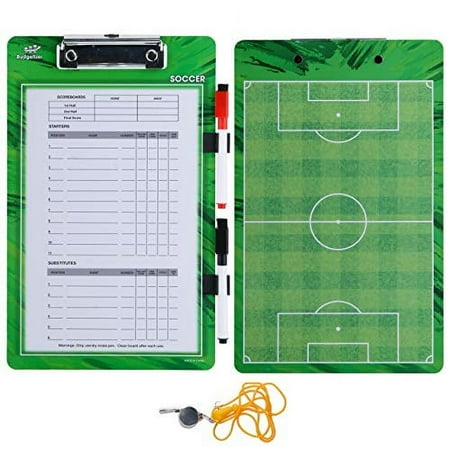 OUR BUNDLE INCLUDES A WHISTLE AND 2 DRY-ERASE MARKERS – Our unique bundle includes 1 dry erase clipboard 2 removable pen holders a metal clip 1 stainless steel soccer coach whistle with a lanyard 2 dry erase markers with an eraser cap in Black and Red and 1 retractable top hook for hanging; This extra loud sports whistle comes with an adjustable lanyard to fit any neck size and can also be attached to keychains making this bundle the ideal coaching board soccer set to improve your skills DOUBLE SIDED SOCCER COACHING BOARD – The front side of our plastic clipboard includes a scoreboard and roster for starters and substitutes with slots for positions names numbers yellow cards red cards goals and sub outs; The back side features a full field to create and erase strategic plays on-the-go making each time-out count and helping players visualize their role on the field; The dry erase design clipboard allows you to change plays as often as you like and wipe it off at the end EASY VISUAL STRATEGY DEMONSTRATION – Our tactical clipboard with pen will ensure coaches stay organized while also clearly communicating strategic plays to players; Each soccer coach clipboard set is the key for success by allowing you to demonstrate tactical formations; Take your planning to the next level while using our coaches clipboard sets that will surely reflect on your team’s performance STRONG PREMIUM QUALITY MATERIALS – We manufacture our coaching clipboard with high quality materials to ensure we deliver a product that is lightweight durable does not bend and is able to withstand rain sweat snow and any wear and tear; Unlike loose paper or chalkboards our sports clipboard has a rugged construction with a strong clipboard clip to hold multiple papers notepad dry erase markers or pens COMPACT LIGHTWEIGHT DESIGN– Our portable clipboard design allows you to carry it everywhere to be prepared for success at all times; It is perfectly sized measuring 12 inches Long by 7.8 inches Wide; Our coaches accessories set is also an amazing gift for any coach; We ensure that our coach lineup board will meet your expectations and offer returns no questions asked;If you have any issues with our soccer clipboard dry erase bundle contact us and we will make sure you have a positive experience