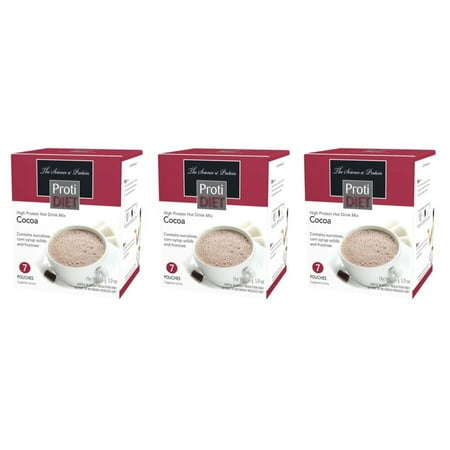 You can enjoy this rich and creamy chocolate treat anytime whether to get your day started off on the right foot as a pick-me-up during a long afternoon or as a sweet way to finish off a productive day. Just mix with hot water and enjoy. The ProtiDiet high protein hot cocoa drink is great for any weight loss plan. This hot beverage will warm you up and while slimming you down! With only 90 calories and 15 grams of protein feel free to indulge without any guilt! A fast safe non-pharmacological way to help you lose weight! Proti Diet 15g Protein Hot Cocoa Drink Mix Highlights: * High Protein Hot cocoa * 15 grams of protein per serving * Only 90 calories per serving * 7 Portion Controlled Pouches Per Box ProtiDiet Advantages: * Quality ingredients * Great taste and texture of products * Large variety * Recognized diet * Worldwide distribution * Personalized customer service * Weight-loss guide available In 1970 Dr. Blackburn began his research on fasting and in 1973 described the protocol for his technique during his Ph.D. thesis examination of the biochemistry of nutrition. That s when the Protein Diet was born. Dr. Blackburn showed that caloric loss combined with the absence of carbohydrates could neutralize any amphibolic effect of insulin on the lipid metabolism. This way insulin was maintained at low levels while the triglyceride catabolism kicked in and the metabolites (particularly the ketone bodies) would provide the organism s energy requirements. The benefits of ketone bodies: The Protein Diet protects the nitrogen balance and suppresses hunger thanks to the state of ketosis that accompanies it. The PD creates the simplest form of ketosis ketogenesis a process that allows the liver to oxidize enormous quantities of fatty acids freeing one of their principal metabolites: ketone bodies. This oxidation process takes place when fatty acids become the organism s principal energy source. Dr. Blackburn determined the exact quantity of proteins to be given to a patient during a protein diet to protect the muscular system. During a 24-hour period the patient must take between 1.2 g and 2.5 g of protein for every kilogram (2.2 lbs) of ideal weight. By this method the protein intake greatly compensates for the mobilization of endogenic proteins. Based on this research ProtiDiet created a line of high-quality protein supplements to help the patients of health care professionals reach their ideal weight via the Protein Diet. Directions: Pour contents of one pouch in 6 to 8 oz (170 to 230 ml) of hot water. Stir with a fork until completely dissolved. Contains: Milk This product is manufactured in a facility that also uses wheat milk soybeans eggs peanuts tree nuts. INGREDIENTS: Milk protein concentrate unsweetened cocoa powder processed with alkali hydrolyzed gelatin gelatin corn syrup solids fructose natural and artificial flavors salt potassium bicarbonate sucralose.