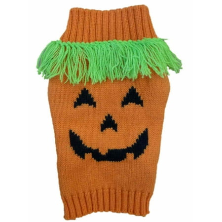 This cozy orange knit dog sweater features a smiling jack-o-lantern with green shag trim. Perfect for your dog s Halloween outing! Dog sizes XX-Small will fit most dogs measuring 6-8 inches from the base of the neck to the base of the tail. Example breeds include: The Chihuahua Shih Tzu and Yorkshire Terrier X-Small will fit most dogs measuring 9-11 inches from the base of the neck to the base of the tail. Example breeds include: The Bichon Frise Maltese Miniature Pinscher and Papillion Small will fit most dogs measuring 12-13 inches from the base of the neck to the base of the tail. Example breeds include: The Dachshund-Miniature Norfolk Terrier and Pekingese Medium will fit most dogs measuring 14-15 inches from the base of the neck to the base of the tail. Example breeds include: The Beagle Jack Russell Terrier Dachshund and Lhasa-Apso Large will fit most dogs measuring 17-19 inches from the base of the neck to the base of the tail. Example breeds include: Cocker Spaniel Schnauzer Corgi and West Highland Terrier X-Large will fit most dogs measuring 20-23 inches from the base of the neck to the base of the tail. Example breeds include: Boxer Basset Hound Border Collie Welsh Corgi XX-Large will fit most dogs measuring 24-27 inches from the base of the neck to the base of the tail. Example breeds include: The Golden Retriever Doberman and Labrador