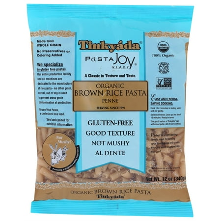 TINKYADA ORGANIC BROWN RICE PENNE PASTA IS AN IDEAL PASTA SUBSTITUTE FOR PEOPLE WHO LOVE GLUTEN-FREE NOODLES. MADE WITH ORGANIC BROWN RICE IN LIEU OF WHEAT THIS PENNE PASTA HAS A CONSISTENT TEXTURE THAT HOLDS UP WELL UNDER YOUR FAVORITE SAUCE. ONE 1.2 C. SERVING DELIVERS 43 G. OF TOTAL CARBOHYDRATE. A SINGLE 12 OZ. BAG OF TINKYADA BROWN RICE PENNE PASTA CONTAINS AROUND SIX SERVINGS OF COOKED PASTA.