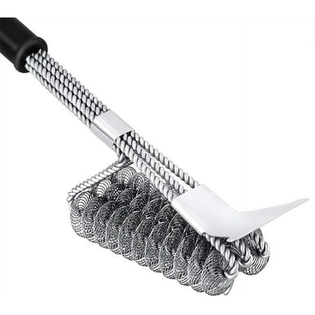 This Stainless Steel BBQ Grill Brush with Scraper is designed for people who do not want bristles.Made of stainless steel material with twisted wire and scraperUsing steps to help to clean your grill1. Pre-heat your grill2.Use the grill scraper to gently scrape off the dirt or grease on the grill.3.Fill a small container with water to dip the grill cleaning brush in frequently while brushing.4.Work in square sections defined by horizontal grates. Don’t glide over horizontal grates as you would with a wire brush.5.Angling the brush backwards slightly can provide a deeper clean depending on the diameter of your grill grates.The BBQ Grill Brush With the unique tight rotation woven design this grill brush cleans the grill for the people who do not want bristles. No sharp edges and don t need to worry about the metal bristles falling out to melt into the food anymore.The handle of grill brush is 17 inch long enough to keep your hands away from the heat; allows the use of both hands with minimal effort.Compatible with multiple grill types such as porcelain ceramic steel iron; gas infrared smoker charcoal and so on.