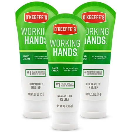 Instantly boosts moisture levels Creates a protective layer on the skin s surface Makes a difference that you will feel within days . Guaranteed relief for extremely dry cracked hands. O Keeffe s Working Hands is a concentrated hand cream that heals relieves and repairs. When used daily O Keeffe s Working Hands is clinically proven to instantly boost moisture levels create a protective layer on the skin s surface and help prevent further moisture loss. For best results apply a small dab (close to the size of a pea) as needed throughout the day. Apply after hand washing after bathing and at bedtime as these are the most effective times for moisturizing extremely dry skin. Mild stinging of severely dry skin is normal but discontinue if it persists. If recommended usage is followed you should begin to see improvement in a week or so. Water Glycerin Stearic Acid Isopropyl Myristate Ceteareth-20 Cetyl Alcohol Cetearyl Alcohol Aluminum Starch Octenylsuccinate Sodium Hydroxide Acrylates/C10-30 Alkyl Acrylate Crosspolymer Paraffin Dimethicone Propylene Glycol Iodopropynyl Butylcarbamate Diazolidinyl Urea Three 3-oz. tubes Unscented Non-greasy Hypoallergenic Clinically proven. Apply after hand washing after bathing and at bedtime as these are the most effective times for moisturizing extremely dry skin . Product Disclaimer: Product pages contain information provided by third-party sellers and other content providers. Despite our best efforts to make sure that information is accurate we don’t guarantee it and images descriptions specifications or other attributes may be incomplete out of date unreliable or miscategorized. Before you buy use or consume a product you should always review nutritional ingredient and allergen information and any warnings or instructions. We don’t guarantee the accuracy of nutritional labels or any other information on product packaging.