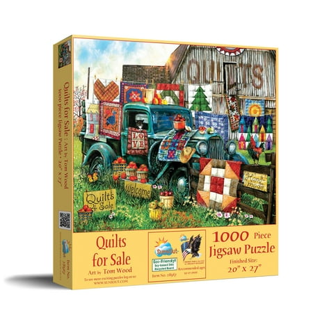 Discover the charm of American nostalgia with the Quilts for Sale 1000 Piece Jigsaw Puzzle by SunsOut. The puzzle designed by renowned artist Tom Wood immerses you in an idyllic quilt sale scene set within a cozy nature backdrop. Measuring 20 x 27 it s more than just a puzzle – but a slice of timeless Americana art to cherish. Lovingly crafted in the USA SunsOut puzzles renowned for their precision durability and embracing eco-friendly practices utilize quality recycled cardboard and soy-based inks for their creations. The interlocking pieces glide together flawlessly transforming the construction process into pure joy while their commitment to excellent customer service ensures any issue with damaged or missing parts is promptly handled. This 1000 piece jigsaw puzzling delight makes a perfect gift for an art-loving adult puzzle enthusiast looking for a fresh challenge. Its striking visuals and enjoyable complexity make it perfect for solo or group puzzling ventures. Through the process of completing this puzzle you re not only assembling an intricate jigsaw but also bringing to life a vibrant display of vintage vehicles and vividly colorful quilts. Showcase your completed work as a celebration of your creativity patience and love for the artistry. Let this extraordinary puzzle transport you to a harmonious fusion of art and nature and give you a remarkable journey from the first piece to the last.