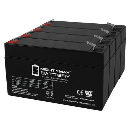 Delivering power when you need it the Mighty Max ML1.3-6 6 Volt 1.3 AH uses a state of the art heavy-duty calcium-alloy grid that provides exceptional performance and service life in both float and cyclic applications. The ML1.3-6 is an Absorbent Glass Mat (AGM) technology with a valve regulated design that can be used in enclosed and indoor environments without leaking or maintenance providing a superior performance for thousands of models. Mighty Max SLA batteries are utilized in a wide variety of applications including; Consumer Electronics Electric Vehicles Engine Starters Golf Carts Hunting Lawn and Garden Tools Medical Mobility Motorcycles Power sports Portable Tools Solar Toys and Hobby Access Control Devices Emergency Lighting Security and more. Specifications: Voltage: 6 Volt Amperage: 1.3 AH Chemistry: SLA AGM Terminal: F1 Quantity: 4 Batteries Battery Dimensions: 3.82 in x 0.98 in x 2.24 in Weight: 0.64 Lbs Warranty 1 Year