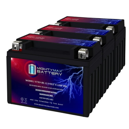 This YTX9-BS is a sealed lead-acid (SLA) absorbed glass mat (AGM) rechargeable battery. AGM and GEL batteries are lead-acid and of the same battery chemistry. This battery comes already charged sealed maintenance free and ready to install. Premium quality absorbed glass mat technology (AGM) is ideal for ATVs Motorcycles Personal Watercraft Jet Ski s Snowmobiles and more. Specifications of the YTX9-BS Battery Voltage: 12 Volt Amperage: 8 AH Chemistry: SLA AGM Terminal: Nut & Bolt Quantity: 3 Batteries Battery Dimensions: 5.90 in x 3.38 in x 4.25 in Weight: 6.72 Lbs Warranty 1 Year