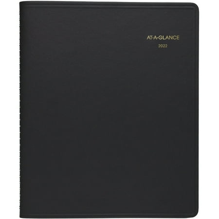 A perfect solution for big picture planning. Keep track of your time with this AT-A-GLANCE monthly planner. Plan more effectively each month by seeing the big picture. Two-page spreads show one month at a time with large unruled daily blocks for event planning and tracking important dates. Monthly planner covers a 12-month date range from January to December 2022 with Julian dates. One month per two-page spread with unruled daily blocks. Page size: 7 x 8.75 . Cover is made of faux leather and comes in black. Track appointments work schedules social events and more. Guaranteed to last all year. High-quality paper features superior ink bleed resistance. Past current and four future month calendar references for quick date checking. Special pages include a telephone/address page and a perforated memo section for notes. Twin-wire binding keeps the planner firmly intact. 1-year manufacturer limited warranty. Sold as 1 Each.