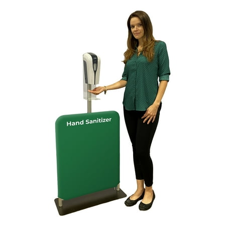 Automatic Sanitizer dispenser floor stand kit. Includes aluminum stand steel base plate touch-free dispenser and double-sided clean your hands here graphic banner printed on american-knit fabric made from 100% recycled plastic bottles. STAND DETAILS: Collapsible light-weight aluminum frame stable steel base. Easy to assemble tool included. Generous double-sided branding area. Graphics are easy to exchange with zipper closure for a wrinkle-free presentation. GRAPHICS DETAILS: Graphics printed on recycled One Planet fabric. Up to 32 plastic bottles recycled to produce one stand! Printed in USA and shipped same day in most cases. Banner size is 24″ wide. Height is available at 55″ 67″ 78″ and 90″. Select your option above when ordering. DISPENSER SPECIFICATIONS: Automatic touch-free infrared sensor. Dosage options 0.4 or 0.8 ml. Window for liquid level visibility. Long lasting ABS plastic construction. Large 32 oz refillable tank. Use with liquid sanitizers you can use any brand. If you prefer gel sanitizer we can provide special gel nozzle head. Uses 4 or 8 AA batteries (last for 15 000 doses) - not included. SUSTAINABLE APPEAL: Made with 100% Recycled Fabric: This product was printed on authentic One Planet fabric made in America from 100% reclaimed plastic bottles. It not only prevents plastic from reaching oceans and landfills but has a cleaner fabrication process with less energy consumption and carbon dioxide emissions. You can now take action to reduce your plastic footprint while you improve your brand exposure.