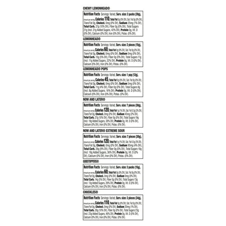 Get a bag of candy for every craving you have this spring! This Kiddie Mix contains Lemonheads Chewy Lemonheads Lemonhead Pops Now and Laters Now and Later Extreme Sours Gobstoppers and Chuckles. Fill up your Easter Baskets or Candy Bowl with a fun variety of candy. Each bag contains approximately 90 pieces of candy.