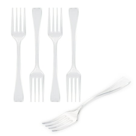 Complete the show-stopping presentation of your individual appetizers and bite-sized desserts with these miniature clear plastic forks. Designed with a crystal clear finish these miniature forks can easily be used to complement all types of fares tablescapes and decors. The premium plastic construction gives extra strength to these fork s sturdy handles while the 4-inch length perfectly accompanies hors d oeuvres passed appetizers salads desserts and other small portions. These small forks are conveniently disposable and fully recyclable -- making them an excellent nature-friendly and disposable cutlery option for buffets banquets tasting events and other catered affairs. Available in a bulk 500 count box.
