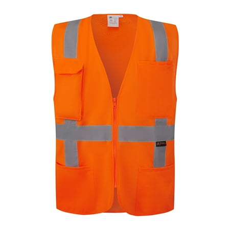 This deluxe safety vest is ANSI/ISEA 107-2015 Class 2 compliant. It has solid front and mesh back and offers durability and great ventilations. It features high-quality reflective strips front zipper closure and 4 outside pockets. The back imprint size is abou 8 w x 10 h. Sizes range from Small to 6XL. Color: Safety Orange