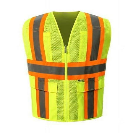 This premium safety vest is ANSI/ISEA 107-2015 Class 2 compliant.It is made of solid fabrics front for durablity and ultra cool mesh back for comfort and great ventilations. It featuress high-qiality reflective tapes with neon orange contrast piping for better visibility. Black bottom for easy care. Inside large tablet / IPad pocket. Dual Microphone Tabs. Front zipper closure and 4 outside pockets. The back imprint size is abou 8 w x 10 h. Sizes range from Small to 5XL. Color: Safety Green