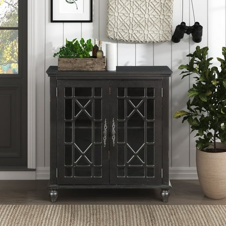 OakvillePark Van Horn Accent Cabinet Black The addition of functional storage space to any home is always welcome. The Van Horn Collection provides classic accent to your home decor while meeting your storage needs. Designed for small space the modern traditional design of this small scaled accent cabinet features behind door shelving turned support feet interwoven decorative mixed media glass and wood doors and antiqued brass hardware. This accent cabinet is also great for using as an sideboard buffet cupboard. Offered in distressed gray black or white finish for versatile decor needs