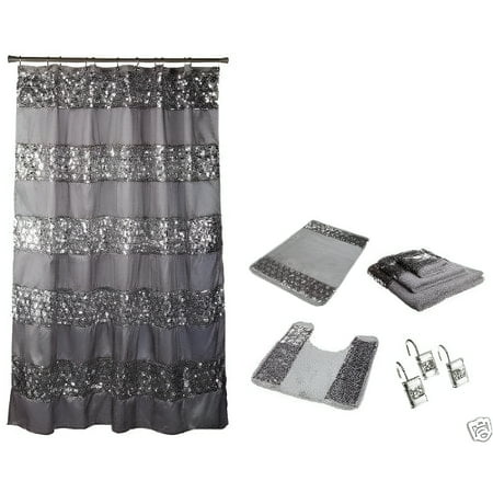 This complete bathroom set includes one 70x72 fabric shower curtain 12 shower hooks one three piece towel set one area rug and one contour rug. Add glam to your bathroom with this champagne-colored set