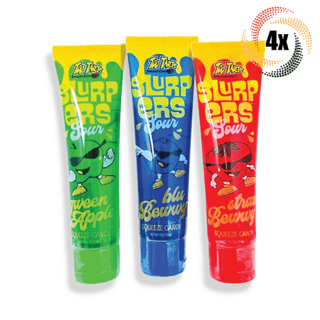 4x Tubes Too Tarts Assorted Fruit Flavors Sour Slurpers Squeeze Candy | 1.05oz Item description Expiration Date 12/24 Food Aisle Pantry Type Squeeze Candy Occasion Halloween Packaging Tube Product Gummy Soft Sweet & Marshmallow Regional Cuisine/Region American Flavor Blueberry Green Apple Strawberry UPC 729843163917 Too Tarts Slurpers delicious squeeze candy tubes come in 2 Varieties Sweet and Sour Great Summer Candy each flavor has 3 fruit flavors included Blueberry Strawberry and Green apple. Makes a fun addition to any social gathering kid’s birthday party Halloween trick or treats Holiday stocking stuffers...your lucky guests will thank you! Type: Squeeze Candy Flavor: Assorted Weight: 1.05oz Packs Included: (4)