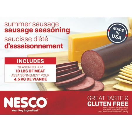Add a homemade touch to party platters or sandwiches with NESCO Summer Sausage Seasoning. Make fresh homemade summer sausage from ground beef pork or venison. To use simply mix ta packet of seasoning with 5 pounds of ground meat and add a cup of water. Use a food grinder to stuff casings for a delicious go-to. Personalize your flavors at a fraction of the cost of pre-packaged store bought. Create your own great tasting sausage made at home with fresh ingredients. NESCO Summer Sausage Seasoning is gluten free and made in the USA.