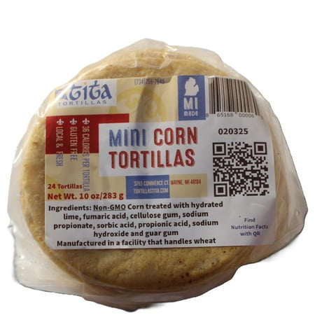 Enjoy the authentic taste of Tortillas Tita Mini Corn Tortillas crafted from freshly ground non-GMO corn using a traditional stone-grinding process in Michigan. These 4.5-inch mini tortillas offer a soft flexible texture and a subtly sweet roasted corn flavor making them ideal for delicious street tacos appetizers and light dishes. Conveniently gluten-free and shelf-stable this product comes in a case of 18 packs with each pack containing 24 tortillas providing a versatile option for your kitchen.