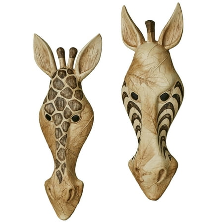 Glimpse wild natural beauty with the Safari Animal Mask Wall Art Set. Crafted from resin each wall art features a dimensional leaf texture across a stylized cream and tan animal face. Giraffe has chocolate spots. Zebra has dark brown stripes. Each animal mask wall accent measures 5.5 Wx2 Dx17.5 H. Set of Two (one of each) Mask wall art has a dimensional leaf texture Stylized animal faces Wild giraffe and zebra designs Cream tan chocolate and dark brown hues.