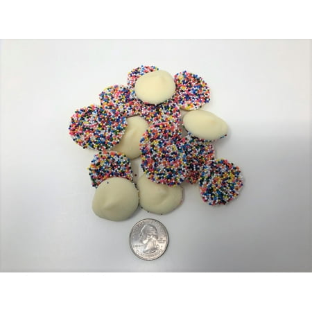 White Chocolate Nonpareils (Multicolor Seeds). A round white chocolate drop with multicolor candy seeds on top and measure approx. 1-3/8 inch in diameter. These have a delicious homemade taste!! This listing is for a 1 pound package of gourmet white chocolate nonpareils.