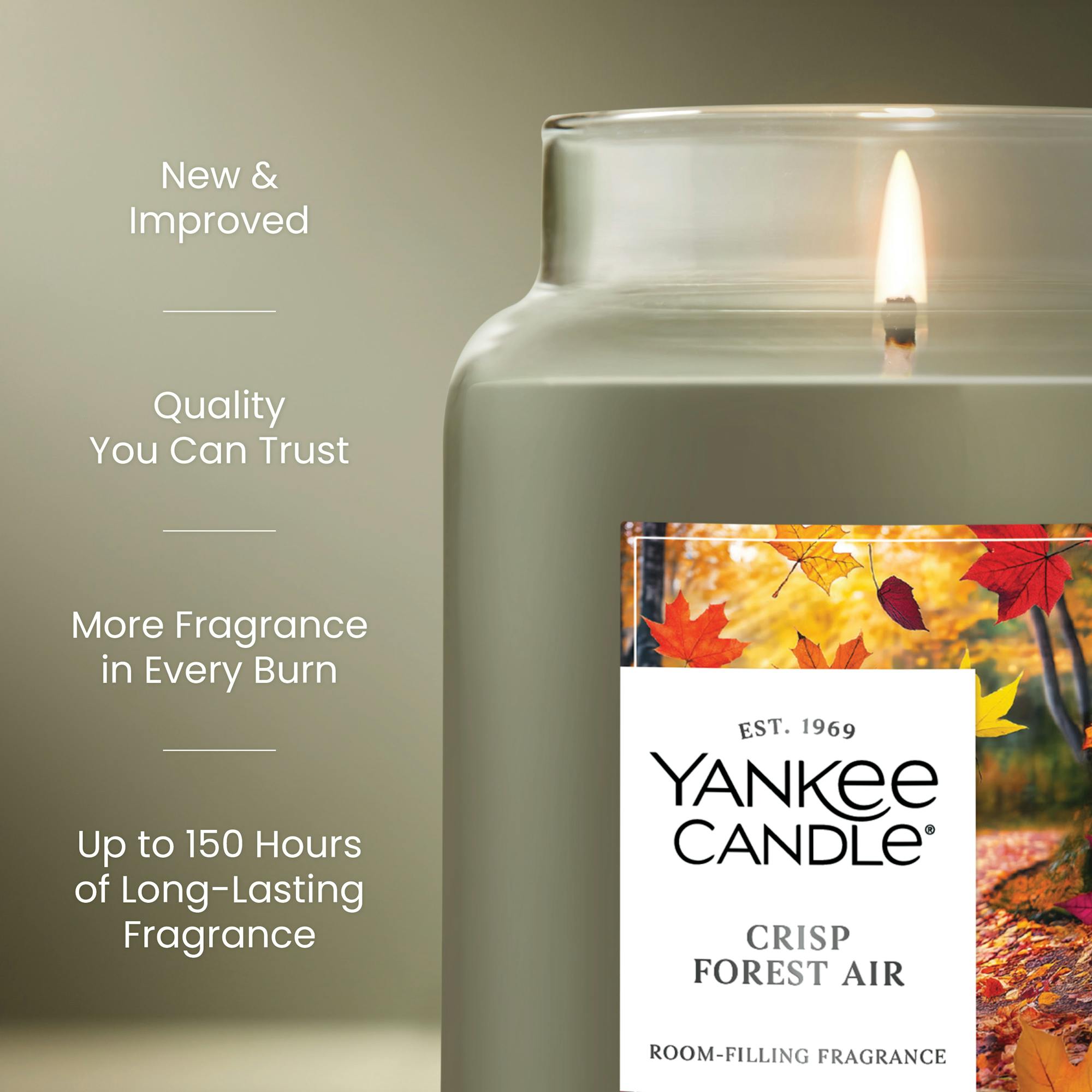 Step into the heart of an autumn woodland with Yankee Candle’s Crisp Forest Air Original Large Jar Candle. This 22 oz masterpiece captures the serene essence of a peaceful forest walk, blending warm cedar, fresh lavender, and earthy forest moss into a harmonious, nature-inspired fragrance. Let the crisp, woody aroma fill your space, transforming any room into a tranquil retreat. As America’s original scented candle, this large jar offers up to 150 hours of consistent, room-filling fragrance. Our new wax formulation ensures a cleaner burn, reducing soot and tunneling for an optimal scent experience every time. Each candle is carefully poured in the USA using a premium plant wax blend and the finest global ingredients, free from parabens, phthalates, formaldehyde, and sulfates. At Yankee Candle, we craft every fragrance with over 50 years of expertise in our Green Lab-certified facility, prioritizing quality and sustainability. We adhere to strict international safety standards set by IFRA and ASTM, so you can enjoy your candle with confidence. Visit YankeeCandle.com to bring the refreshing, calming scent of a forest breeze into your home. Perfect for creating a cozy atmosphere during autumn or any season, Crisp Forest Air is more than a candle—it’s an invitation to relax and reconnect with nature.